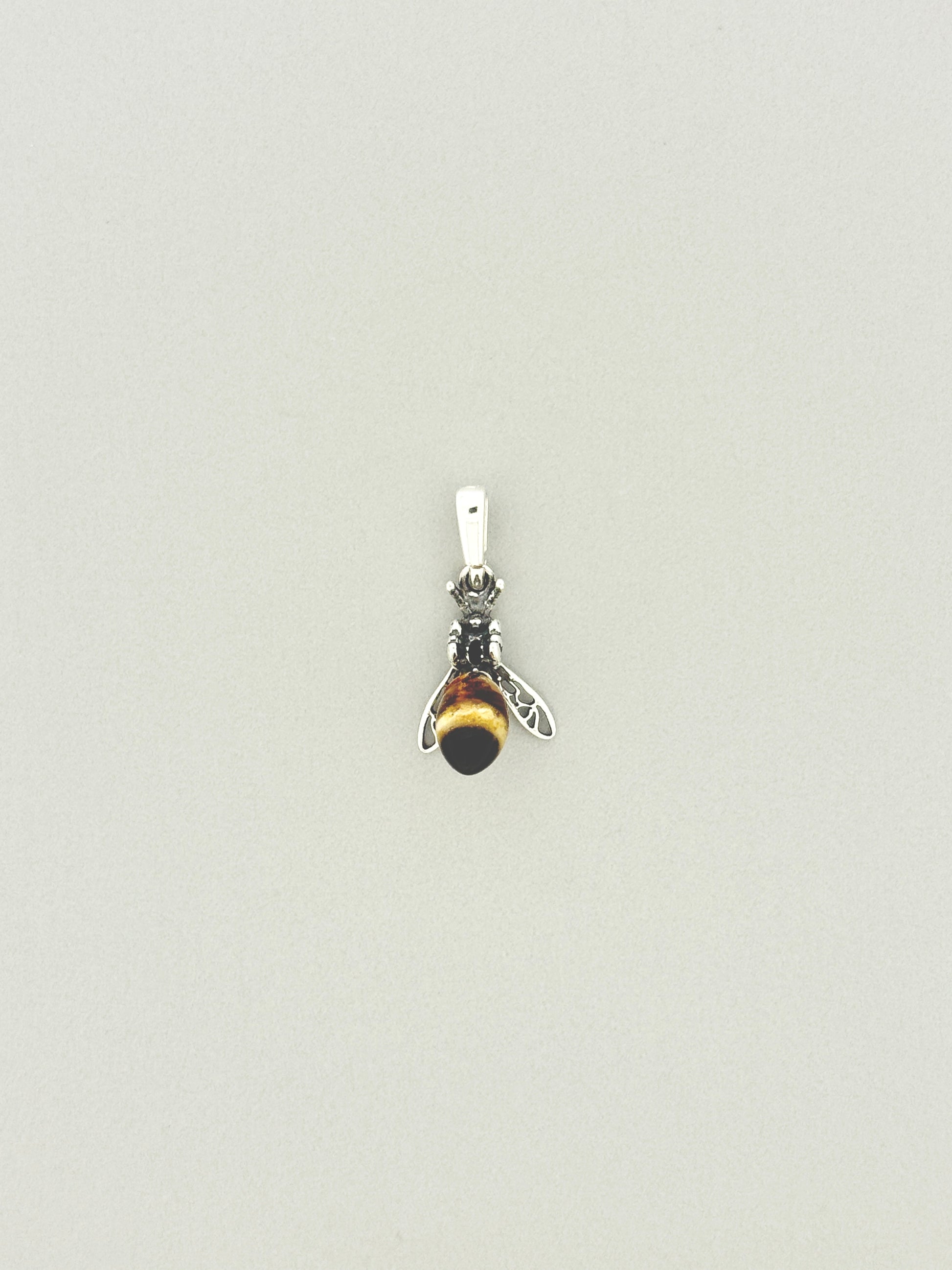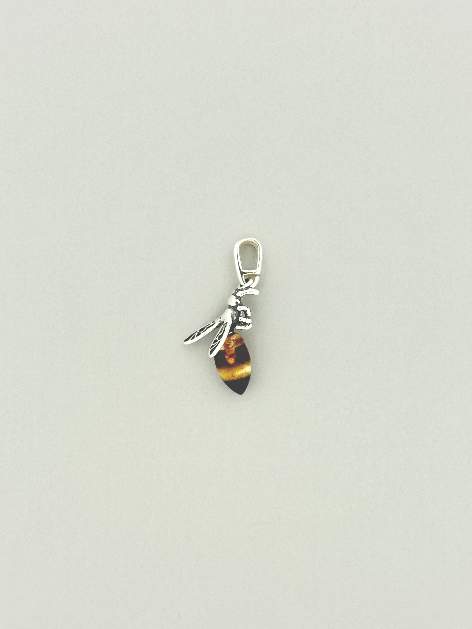 From our carefully curated collection. Set in .925 sterling silver, this instantly endearing pendant is one of the most fanciful pieces in our collection. Utilizing small slices of warm-orange, beige-butterscotch, and deep-burgundy Baltic amber, this charming pendant depicts a bee peacefully at rest, as though the little creature is enjoying nectar from a blossoming flower. 25mm x 11mm.
