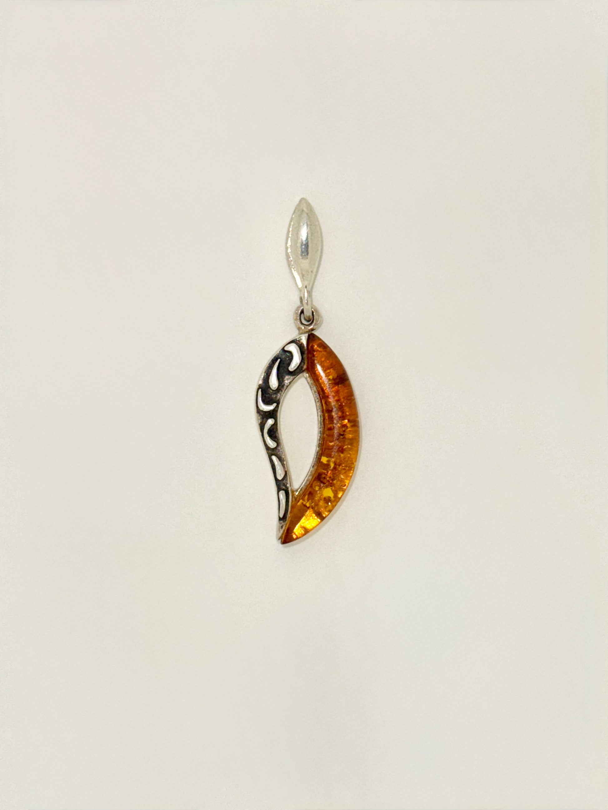 From our carefully curated collection. Set in .925 sterling silver, this lovely piece showcases the warm-orange tone found in Baltic amber in a striking, night-and-day contrast with a pattern of shiny and oxidized .925 sterling silver. The fanciful, curved structure of this pendant creates a soothingly smooth appearance for the eye to gaze over unhurriedly. 42mm x 13mm.