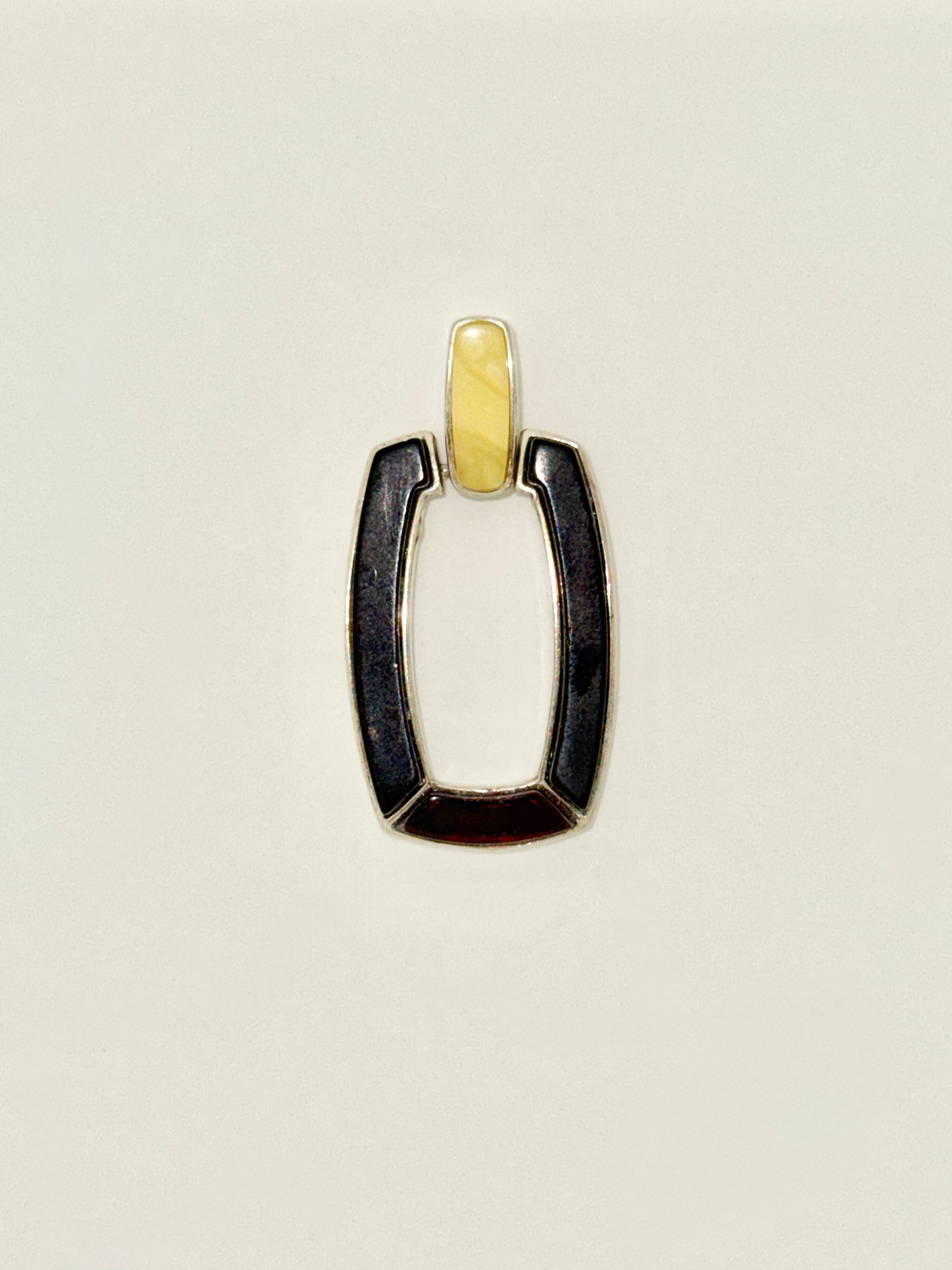 From our carefully curated collection. Set in .925 sterling silver, this pleasantly geometric piece features both the deep-burgundy-verging-on-brown and the butterscotch hues found in Baltic amber. This eye-catching contrast is aided by the barely visible border of .925 sterling silver encircling both pieces of fossil tree sap, creating a balanced pattern of dark color accented by light tones and reflection. 38mm x 20mm.