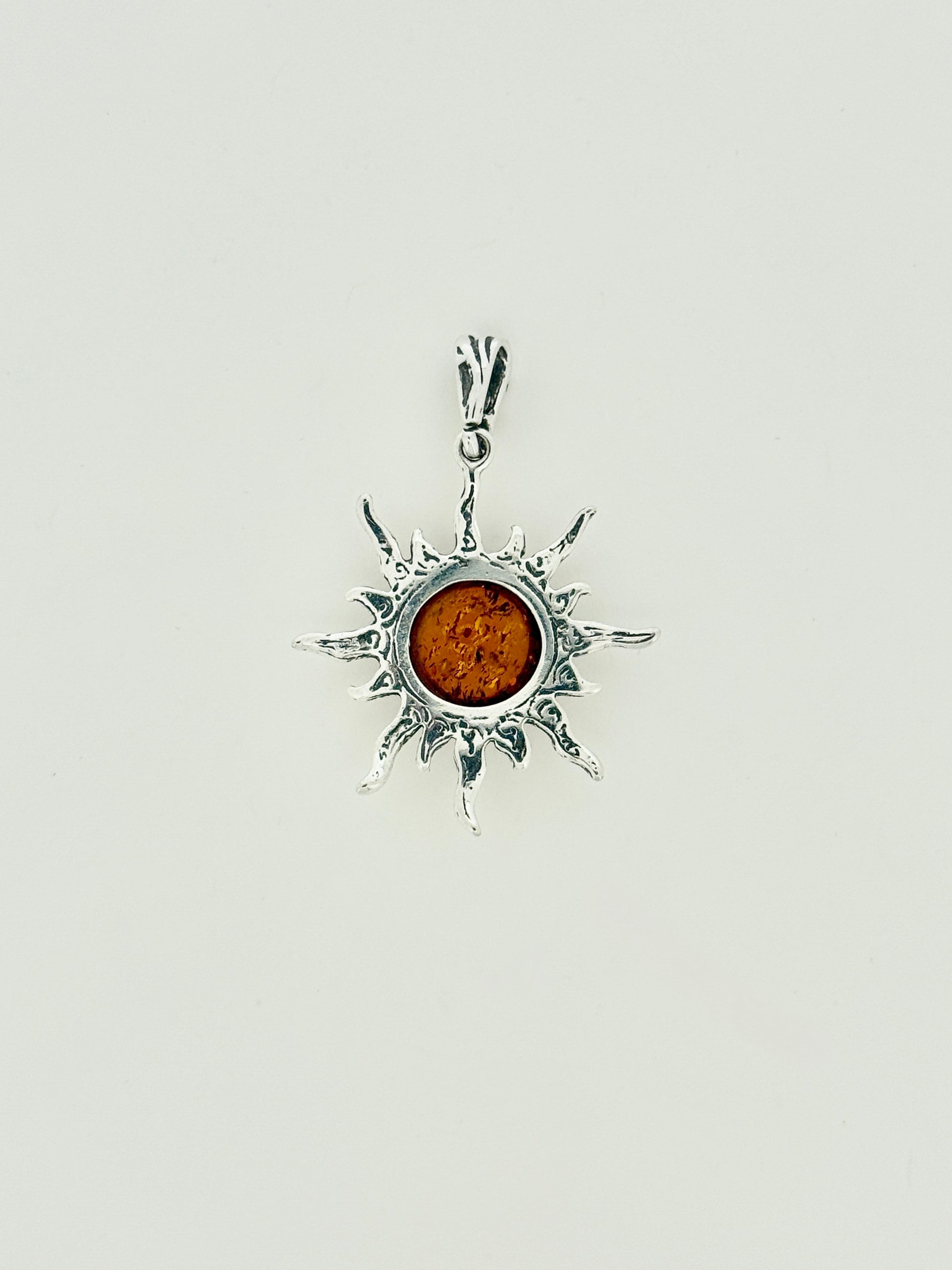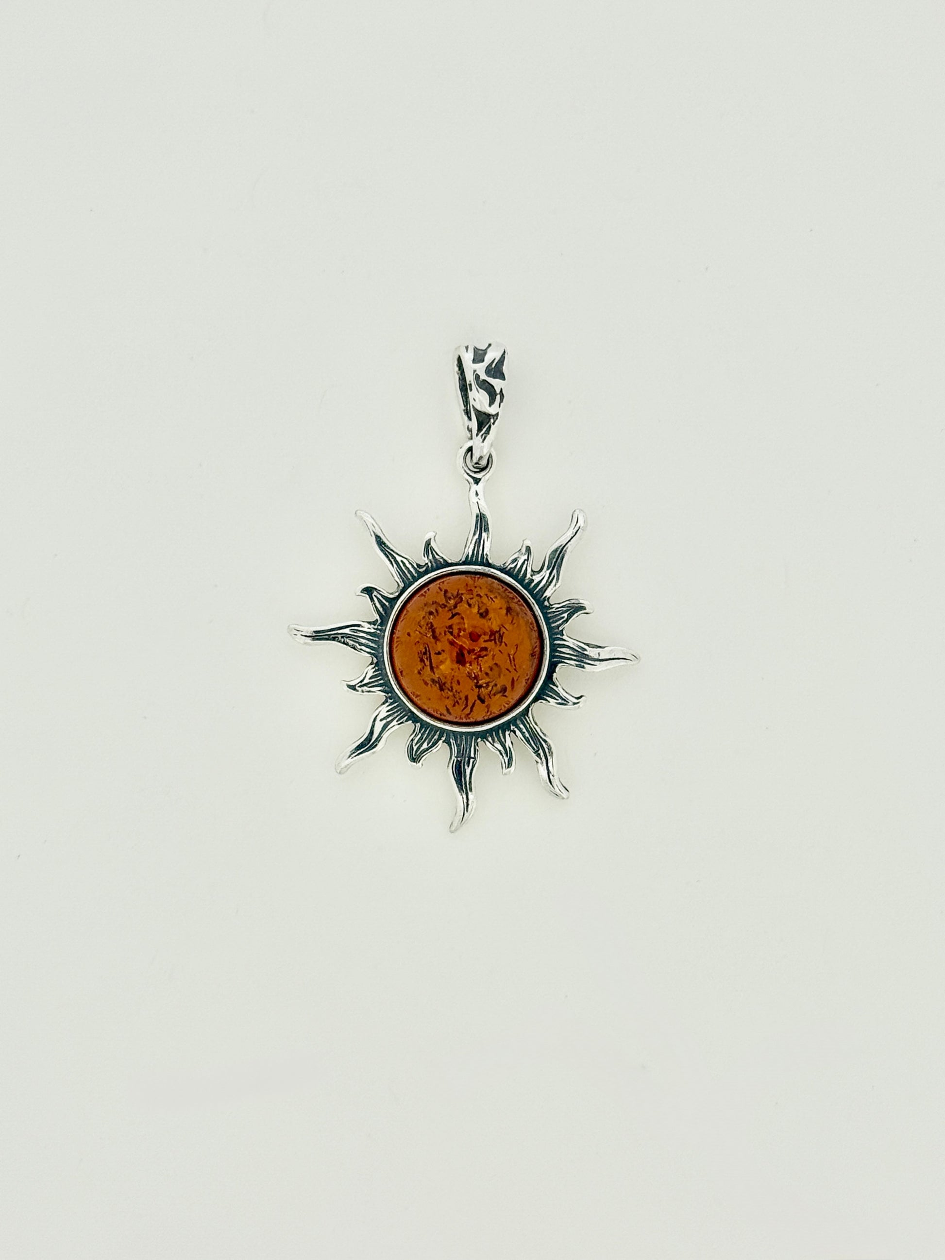 From our curated collection. Set in .925 sterling silver, this charming piece is a semi-translucent, warm orange. Although the surface is smoothly polished, the details of the material naturally incased in this fossil tree sap give this pendant additional depth and eye-catching intrigue, splendidly accented by the intricate silverwork of the sunshine rays. 39mm x 28mm.
