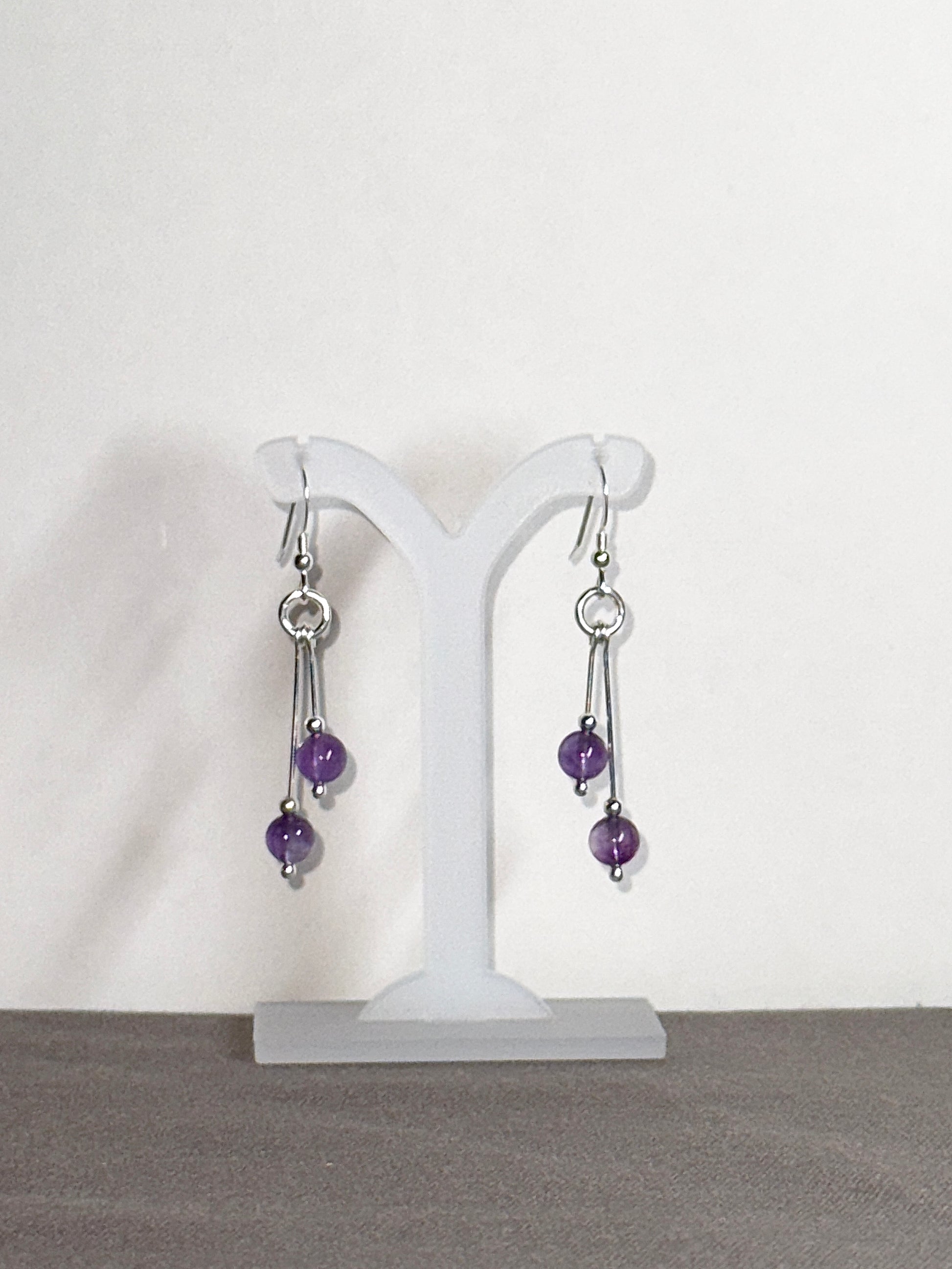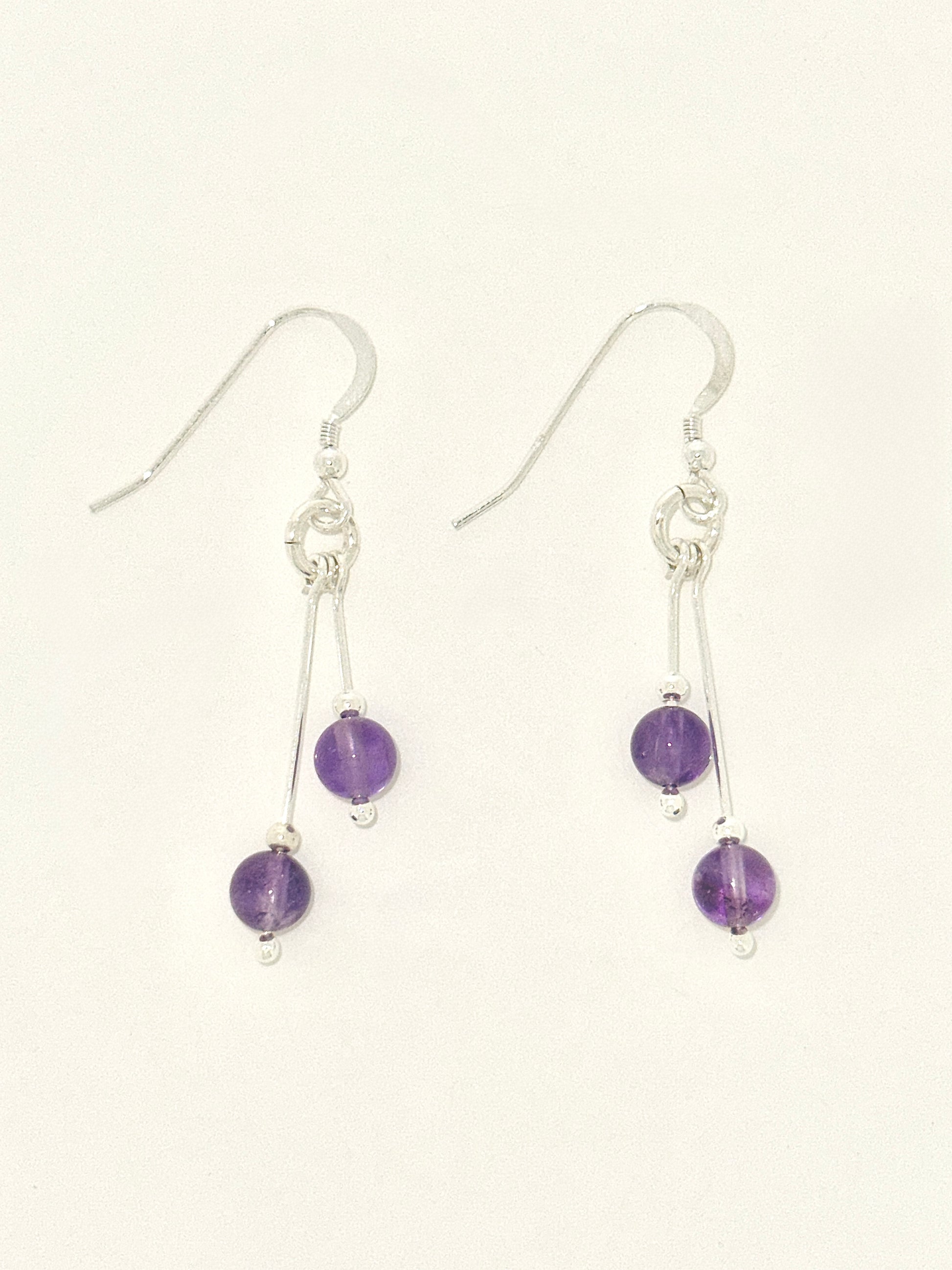 Handcrafted in .925 sterling silver by Paxton Rice. Hanging 50mm long, this lovely accessory is ideal for tastes that desire a subtle but noticeable dash of color without the added length of our tri-dangle style. These purple 6mm gemstone beads are semi-translucent, creating a variety of effects depending upon the way in which the light hits them, and they have been carefully hand-selected by Mr. Rice for a high-quality match. Each bead rotates independently on its wire, providing additional movement and depth for this unique pair of earrings.