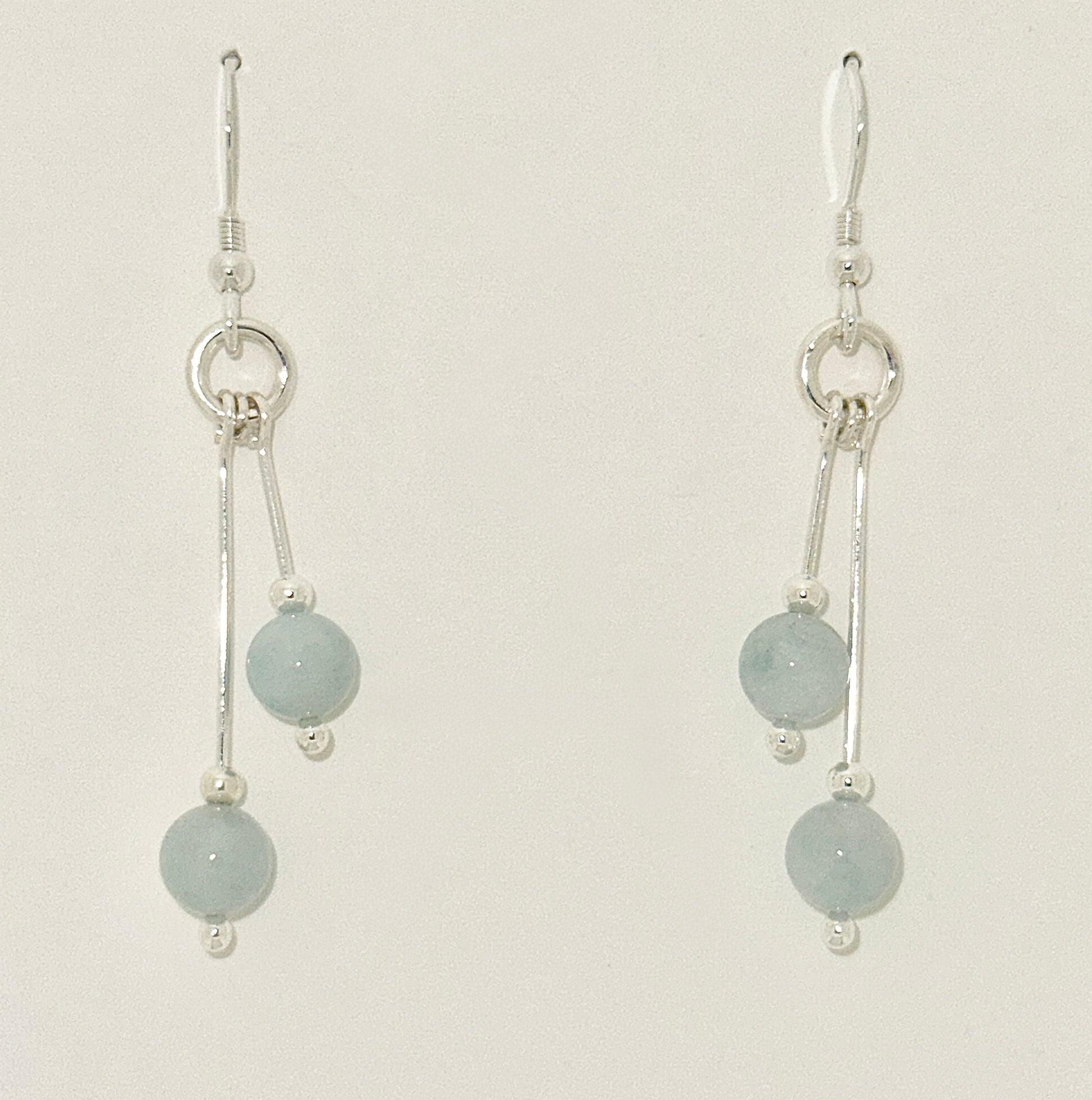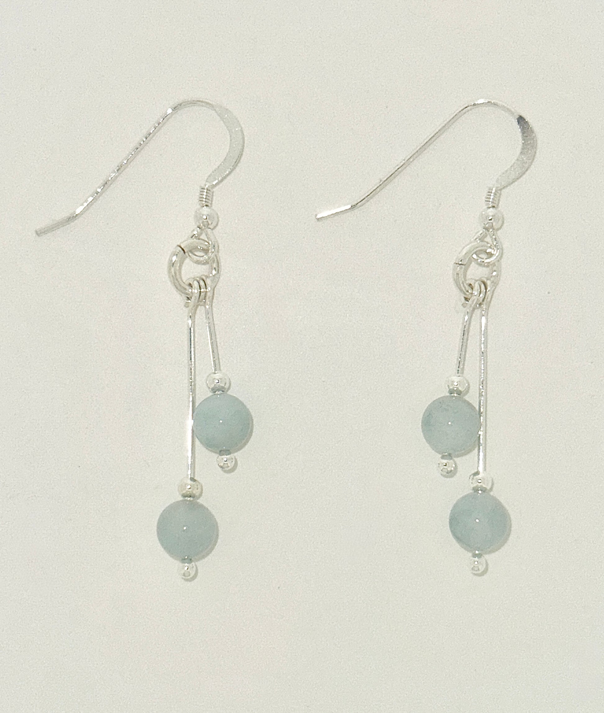 Handcrafted in .925 sterling silver by Paxton Rice. Hanging 50mm long, this lovely accessory is ideal for tastes that desire a subtle but noticeable dash of color without the added length of our tri-dangle style. These 6mm gemstone beads are a light powder-blue, and they have been carefully hand-selected by Mr. Rice for a high-quality match. Each bead rotates independently on its wire, providing additional movement and depth for this unique pair of earrings.