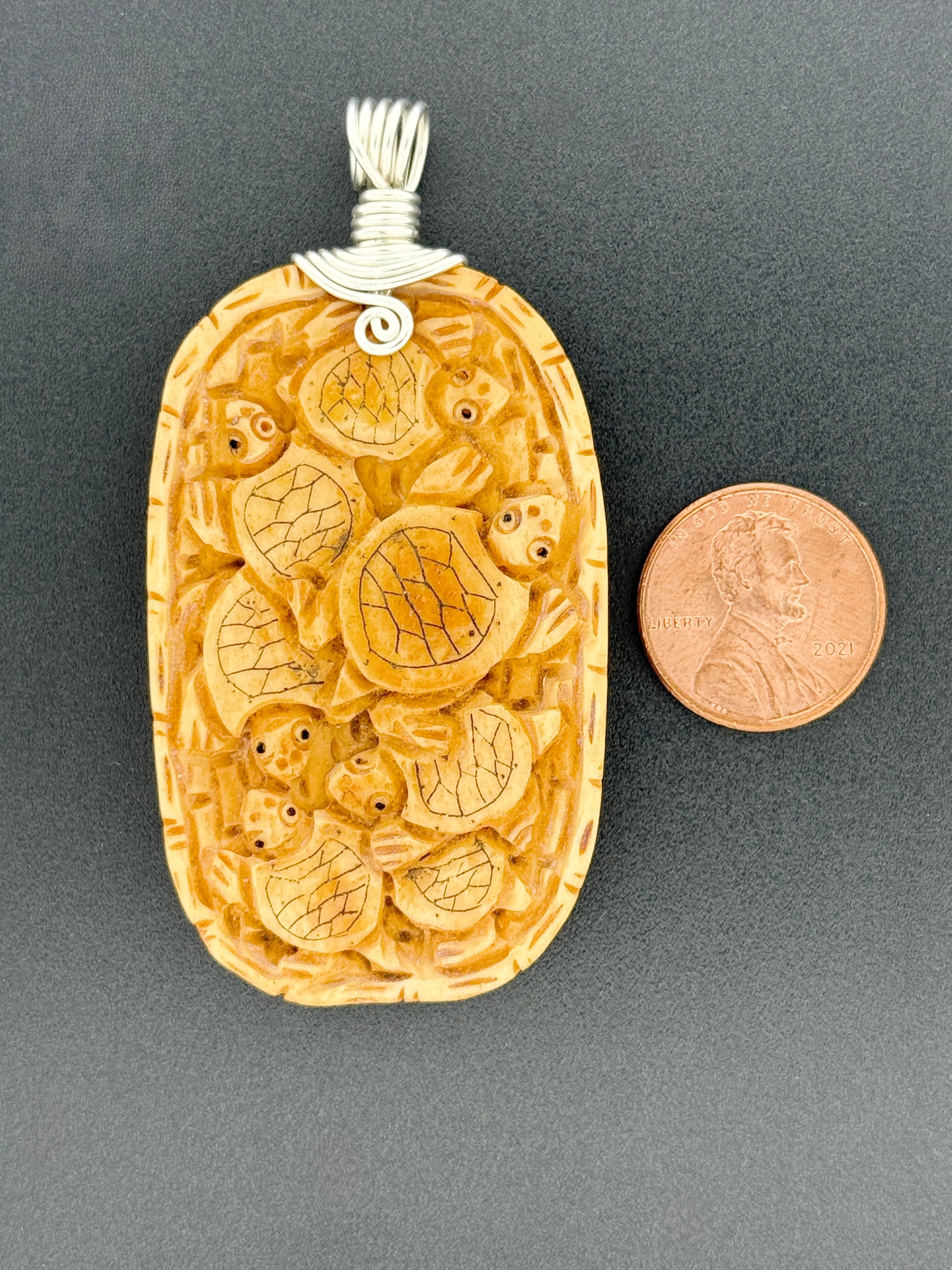 Hand-wrapped with 24-36in. of .999 fine silver wire by Jim Rice. This intricate turtle carving is an excellent illustration of recycling, as it ensures that no part of the valuable work animal is ever wasted, even after it has passed away. With its warm range of beiges and browns, this pendant provides an intriguing pattern for the eye to rest upon. 68mm x 34mm.