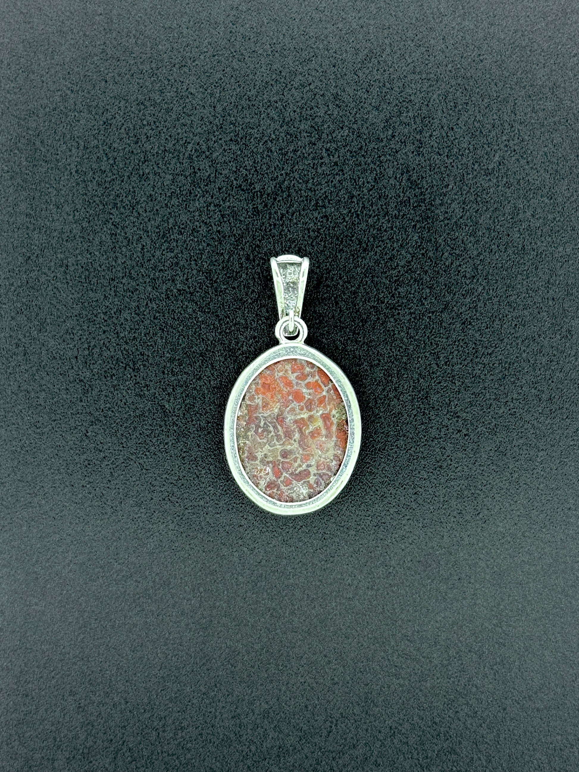 From our carefully curated collection. Set in .925 sterling silver, this lovely pendant features warm red tones accented by small, light-colored veins. The silverwork is fairly minimal, excellently displaying this unique fossil without overwhelming it, providing the rare opportunity not only to admire a piece of natural history but to wear it too. 33mm x 17mm.