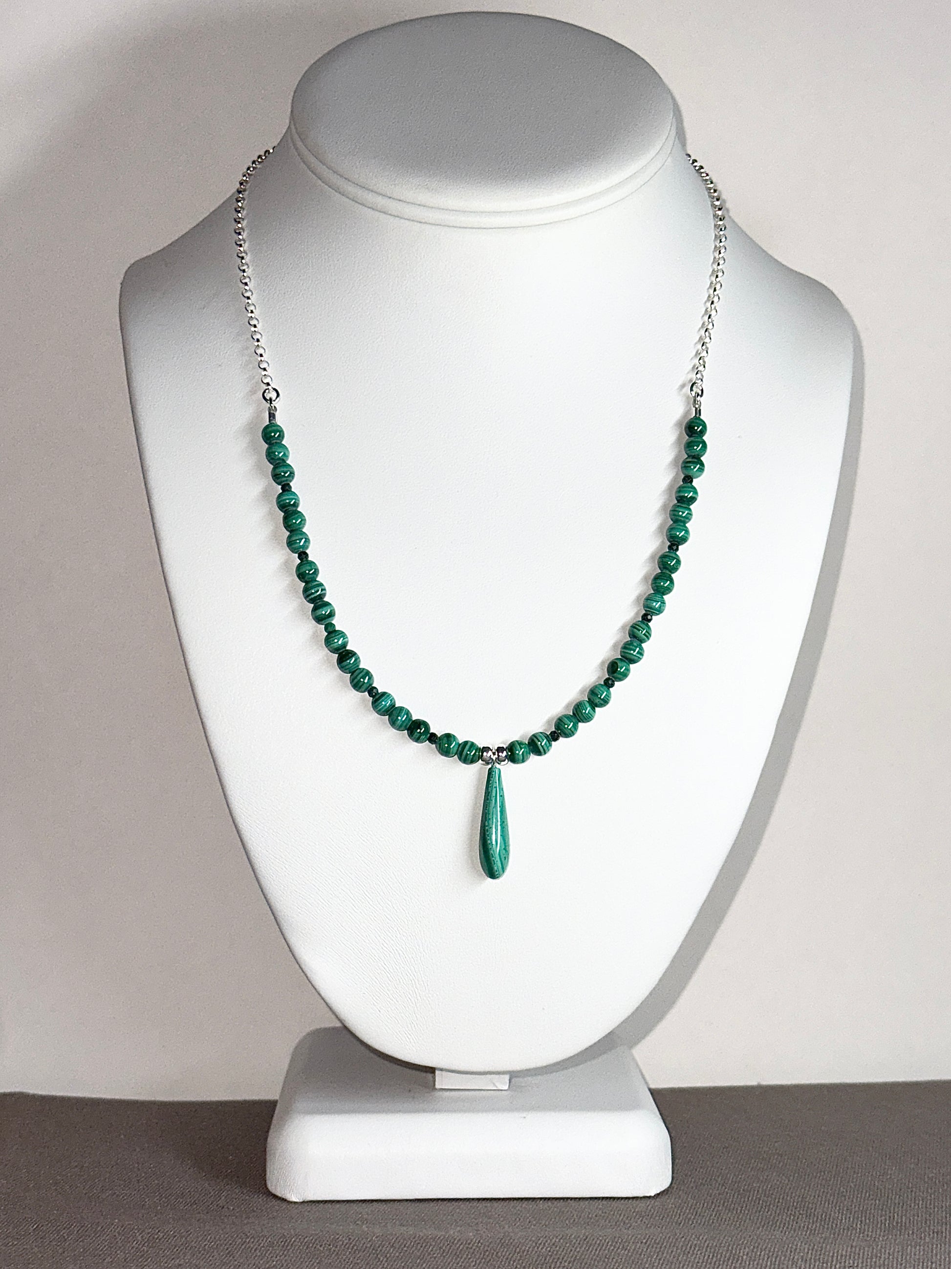 Lovingly handcrafted with a .925 sterling silver Rolo chain by Cindy Rice. This necklace features a soothingly simple array of small beads showcasing a pattern of mint-on-dark-green colors swimming along their surface. The dainty centerpiece of this necklace adds to its gentle tone, creating a focal point for the eye to rest upon without detracting from the lovably mild nature of this necklace. Utilizing the extender, this necklace can be worn at lengths of 18-20in.