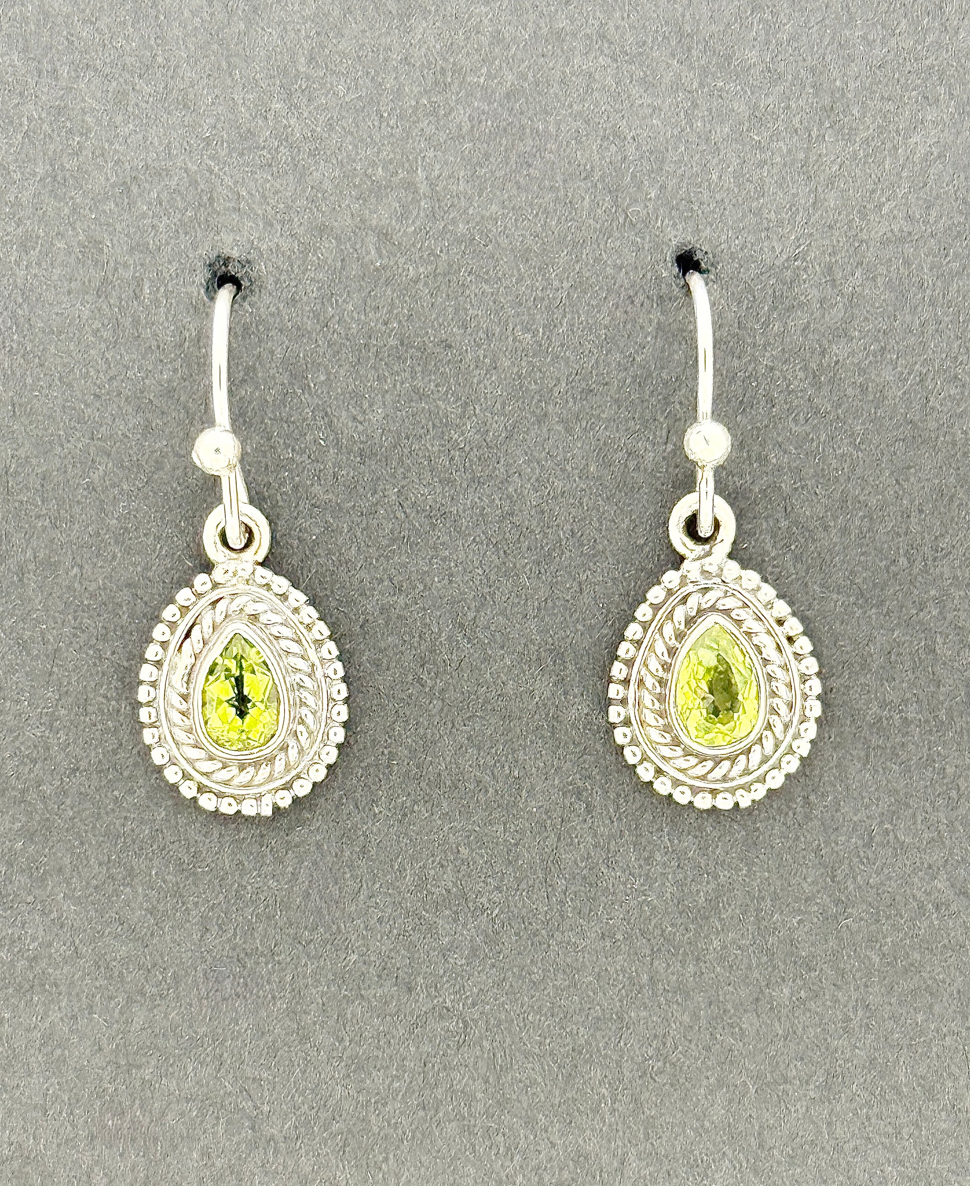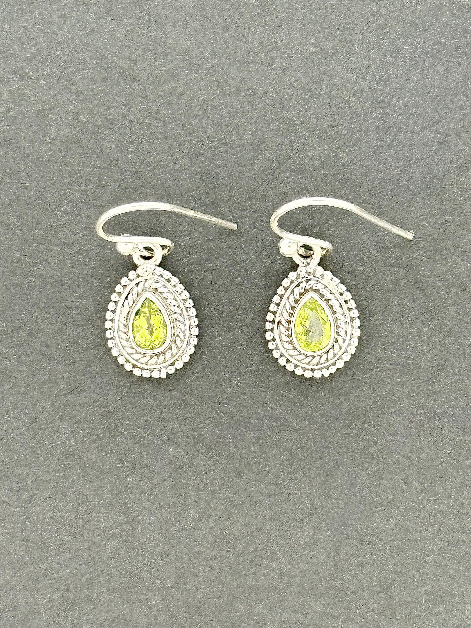 From our carefully curated collection. Set in .925 sterling silver and hanging 27mm long and 10mm wide, this lovely accessory features bold silverwork encompassing bright-green peridot gems. This silverwork displays a braided interior with a delicate border of tiny beads, giving these small earrings an ornate appearance. The faces of these gemstones have been skillfully cut, causing them to sparkle in the light.