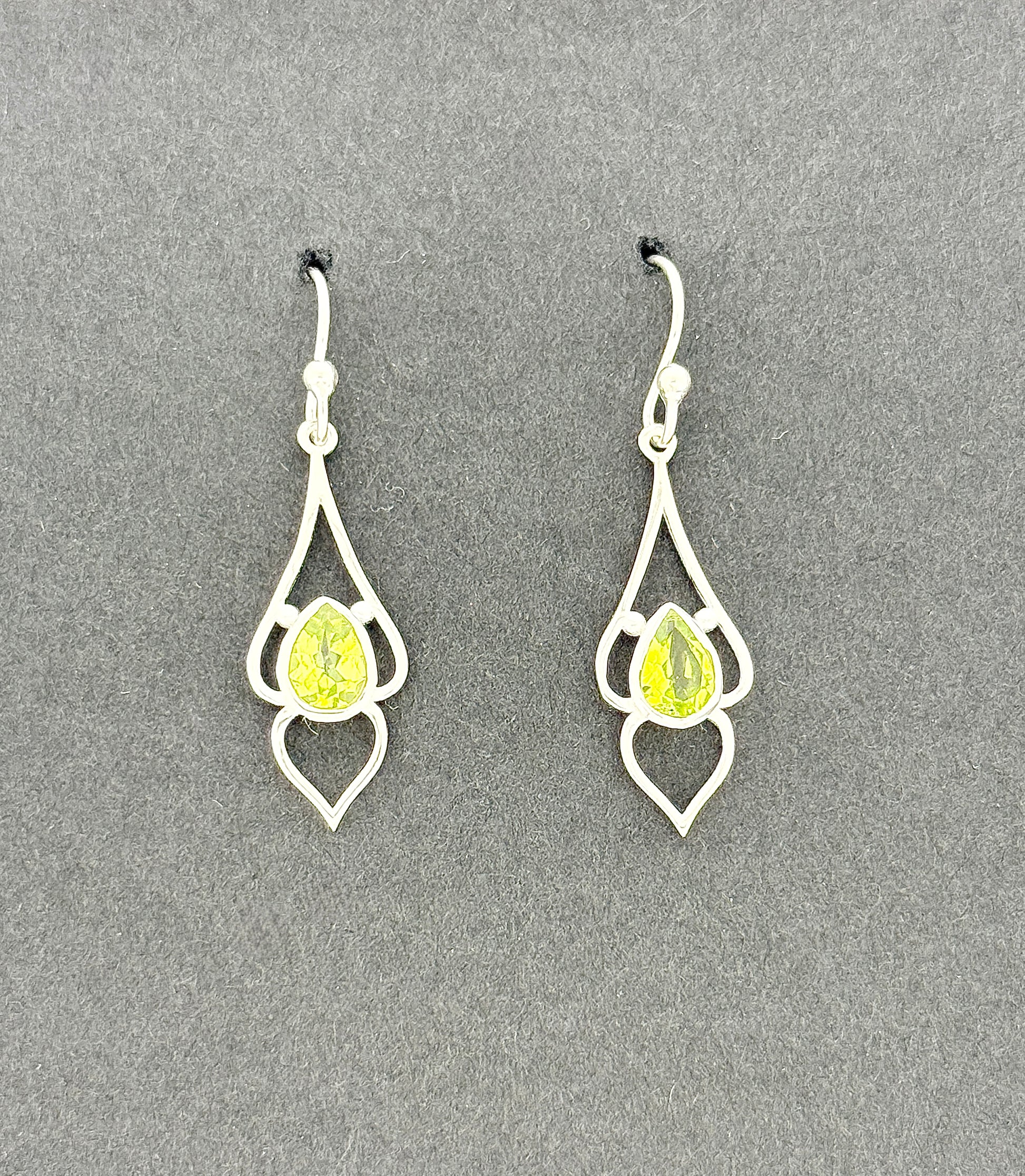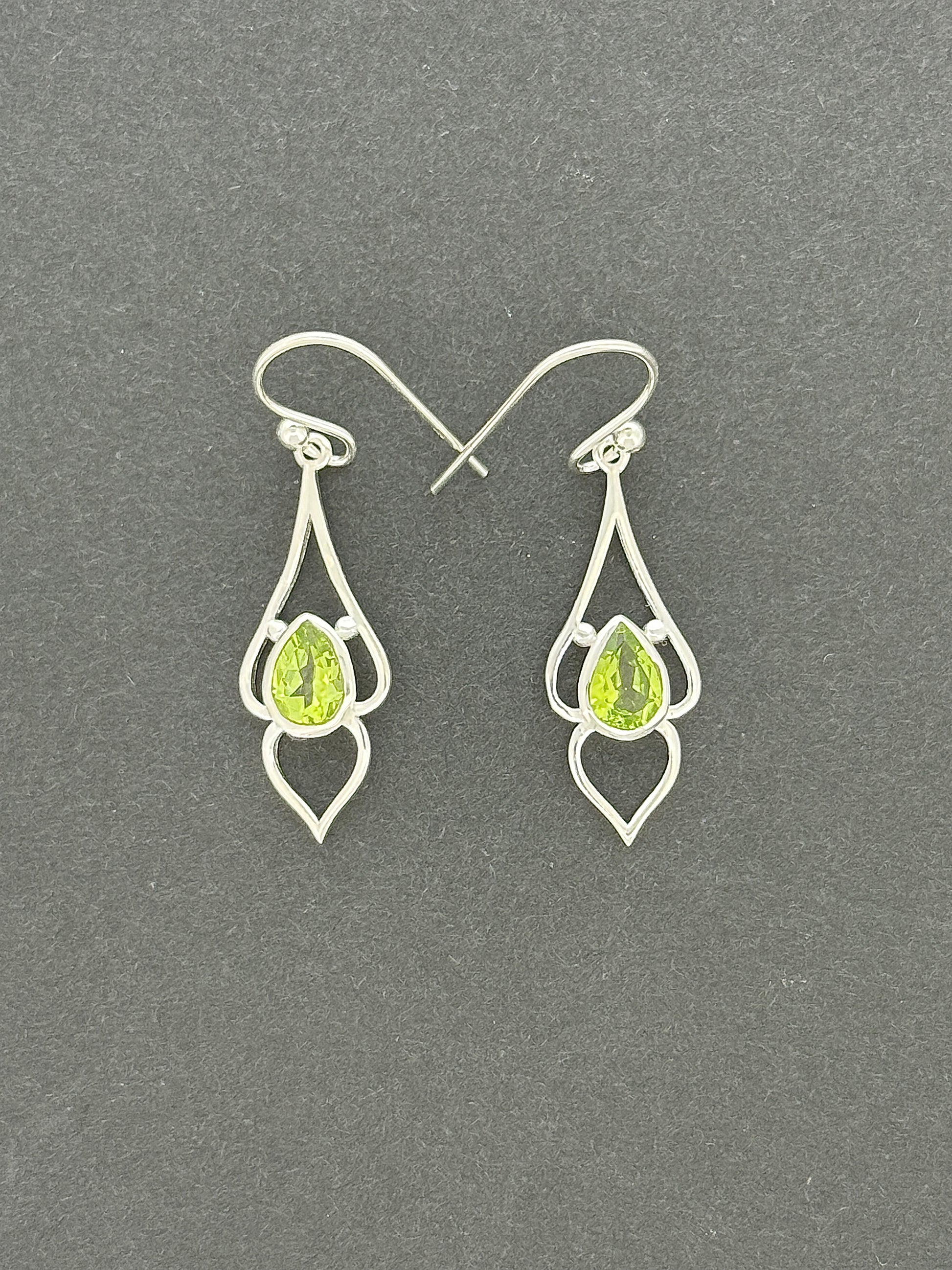 From our carefully curated collection. Set in .925 sterling silver and hanging 39mm long and 10mm wide, this lovely accessory features bright-green peridot stones. The silverwork displays a gentle, curving pattern, giving these earrings a natural character while preserving their refined elegance. The faces of the gemstones have been skillfully cut, causing them to sparkle in the light.