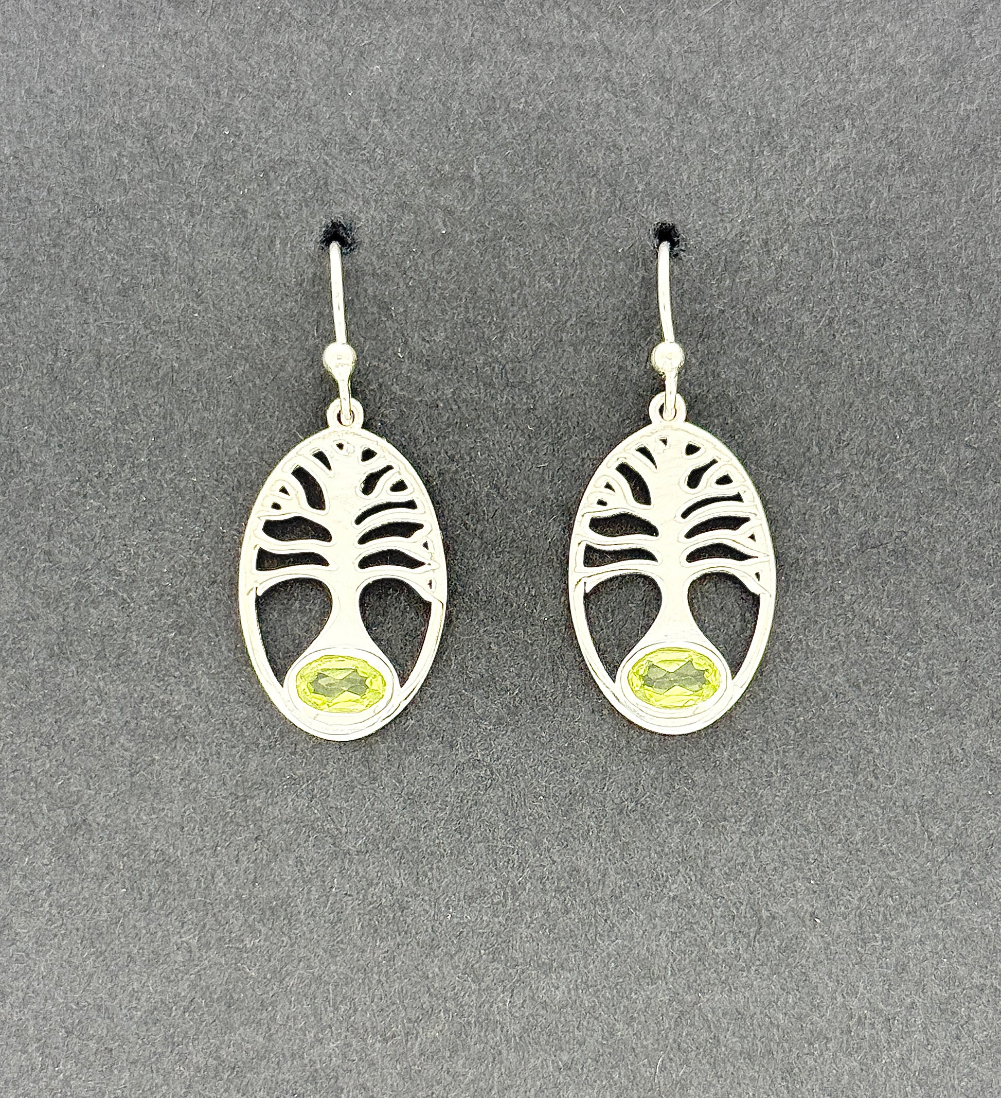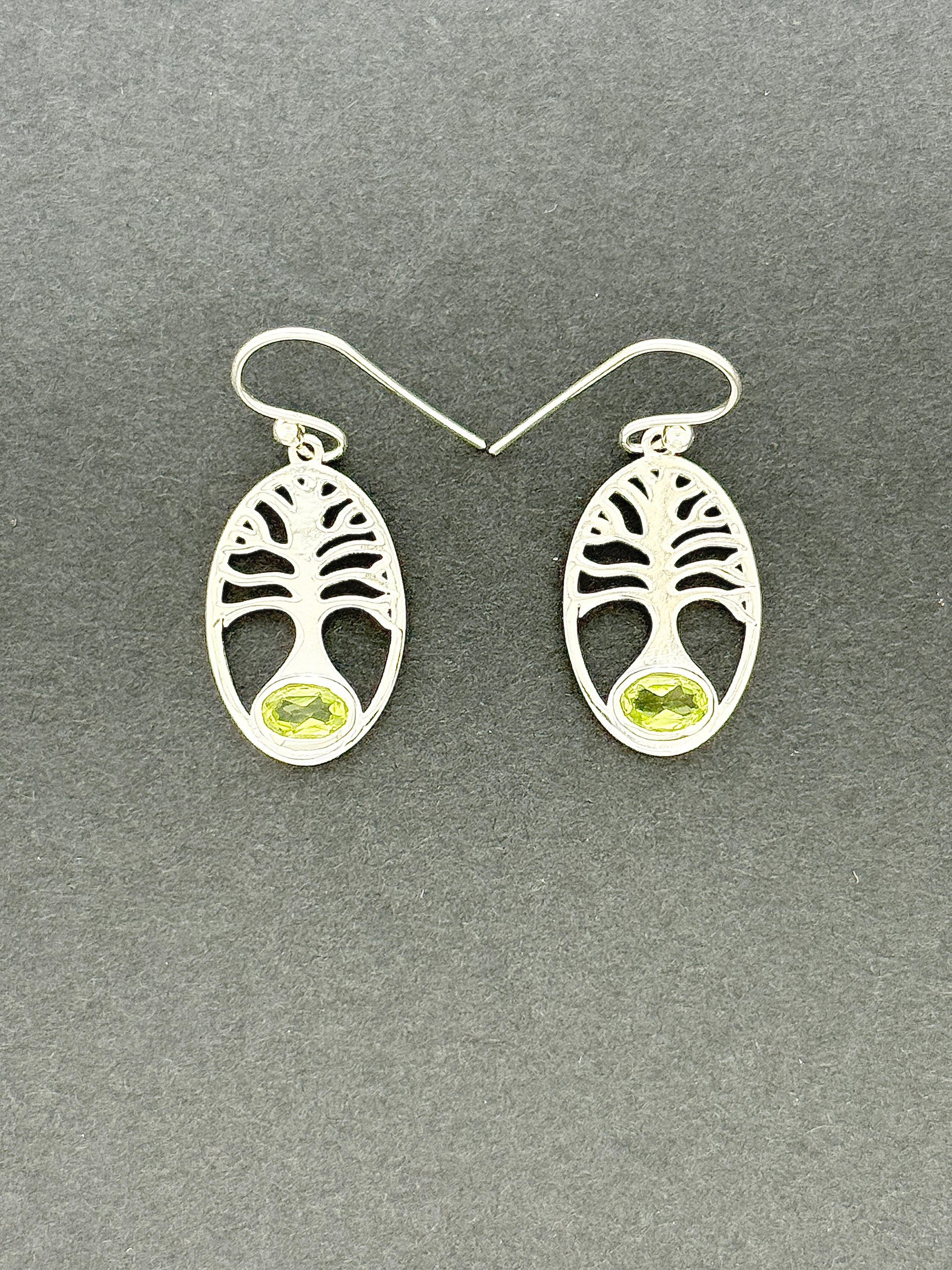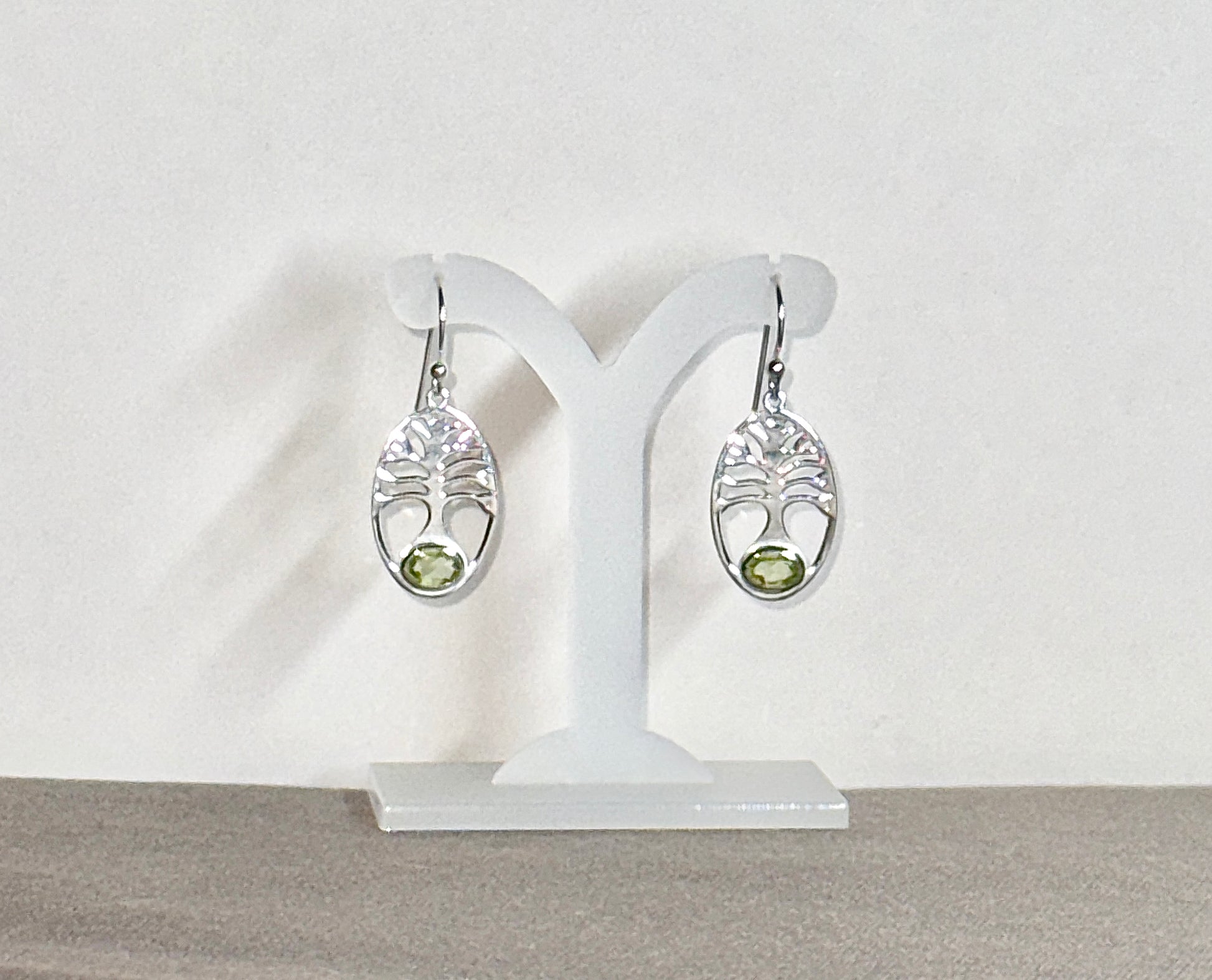 From our carefully curated collection. Hanging 34mm long and 14mm wide, these lovely .925 sterling silver earrings prominently display a slender Tree of Life design with a bright green peridot gem at its roots. The faces of these stones have been skillfully cut, causing them to sparkle in the light.