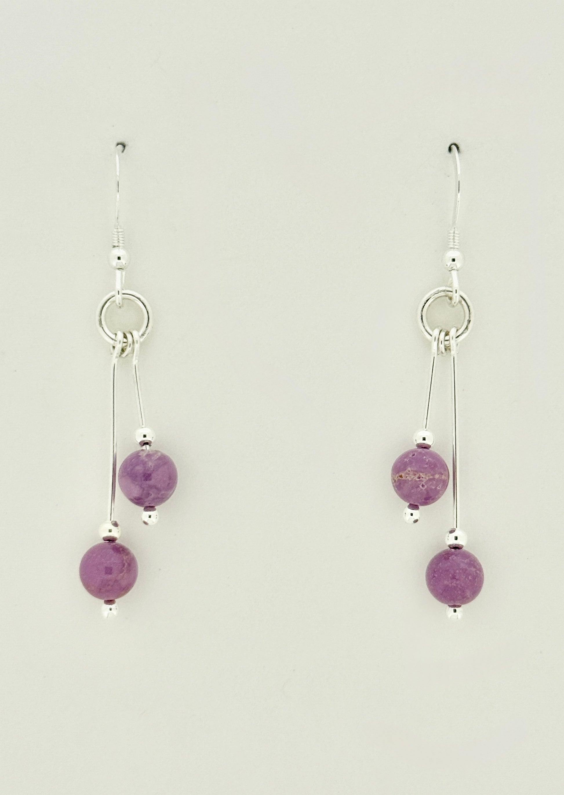 Handcrafted in .925 sterling silver by Paxton Rice. Hanging 50mm long, this lovely accessory is ideal for tastes that desire a subtle but noticeable dash of color without the added length of our tri-dangle style. Each of these 6mm gemstone beads is a delightful bright purple, and they have been carefully hand-selected by Mr. Rice for a high-quality match. Each bead rotates independently on its wire, providing additional movement and depth for this unique pair of earrings.