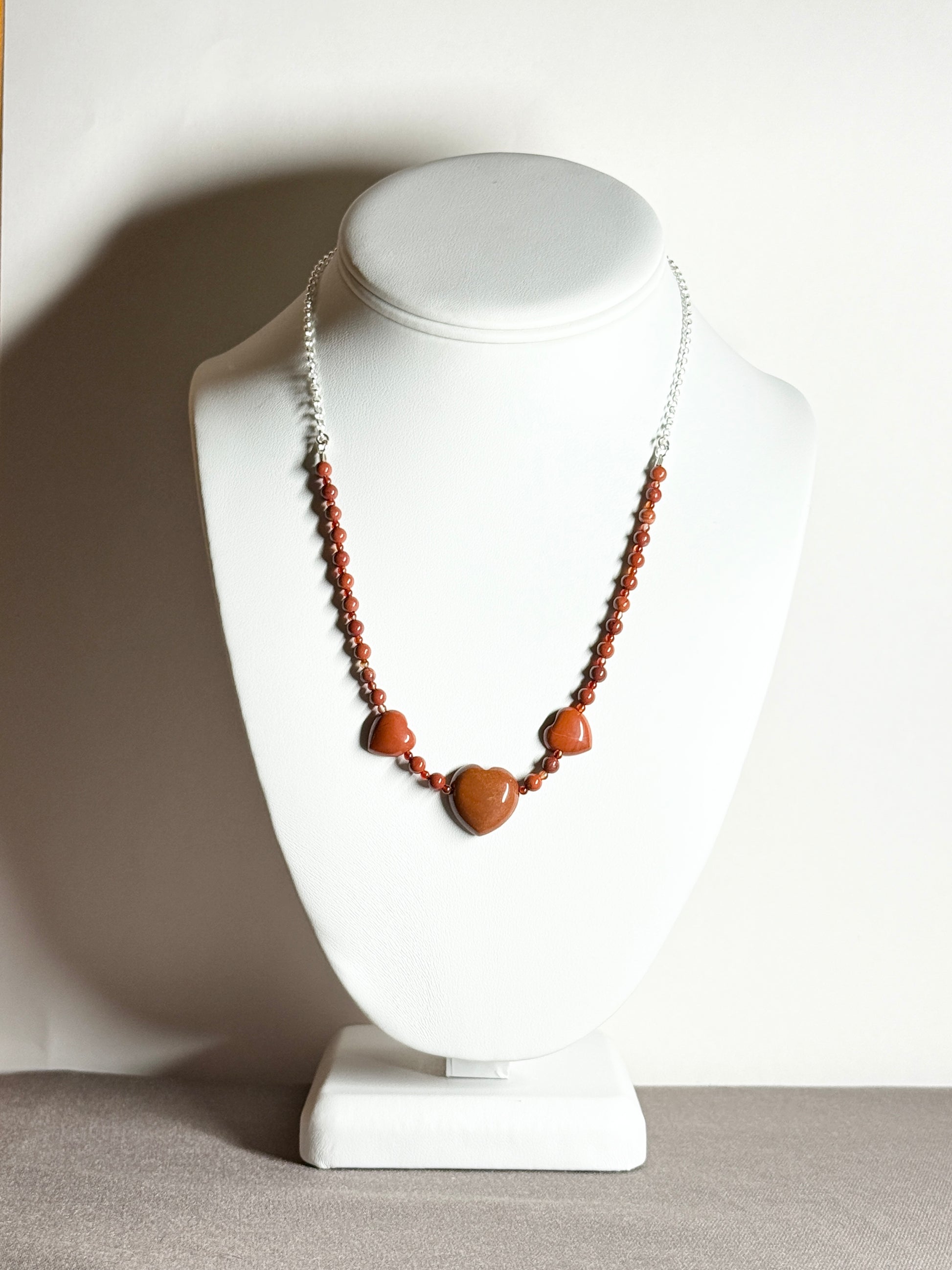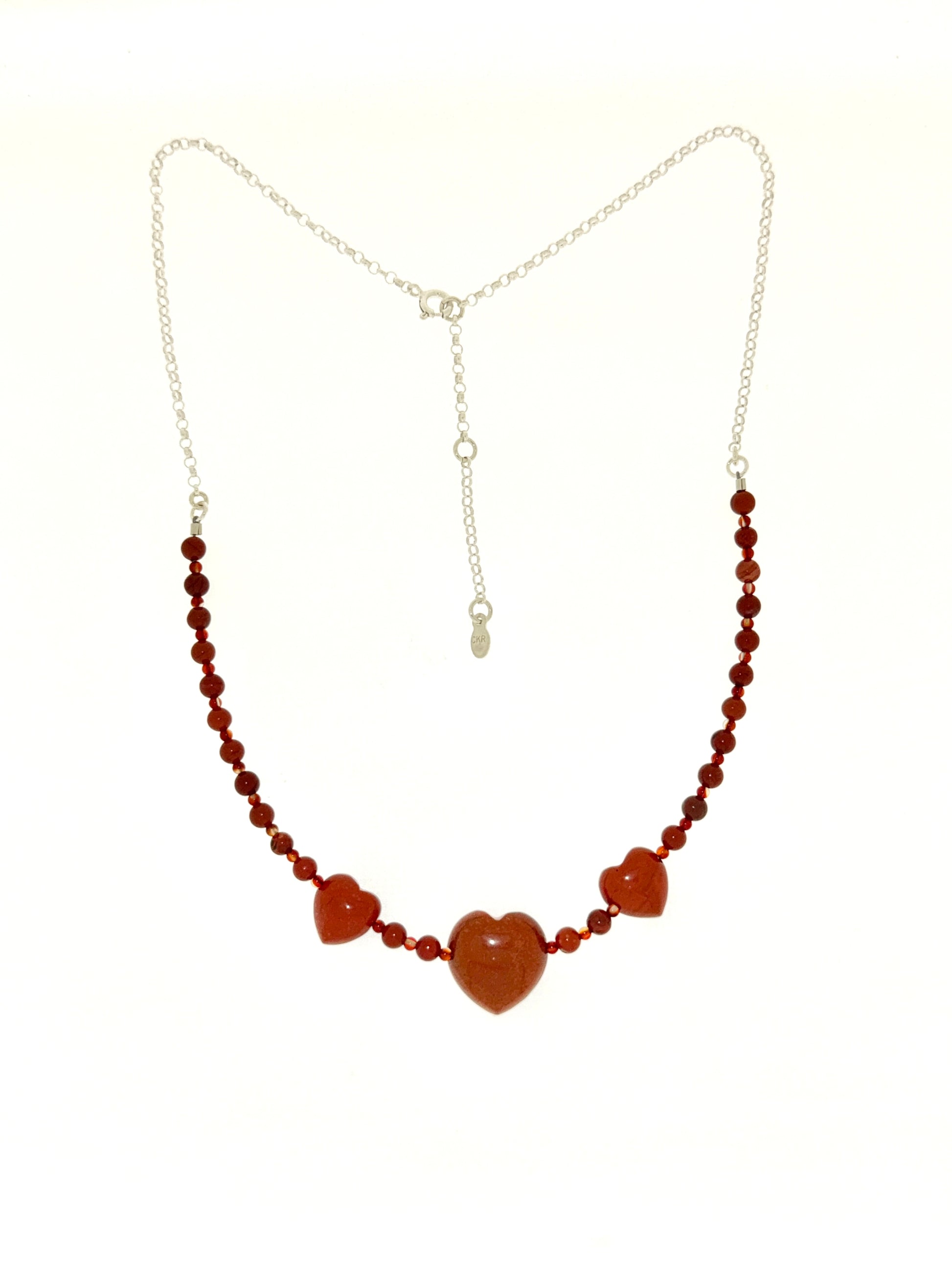 Lovingly handcrafted with a .925 sterling silver Rolo chain by Cindy Rice. This lovely necklace displays a soothing array of warm reds, culminating in three gemstone centerpieces, each in the shape of a heart. The gentle curves and lovable focal points of this piece combine to create a cozy and endearing touch for a range of outfits. This necklace is 18in. long.