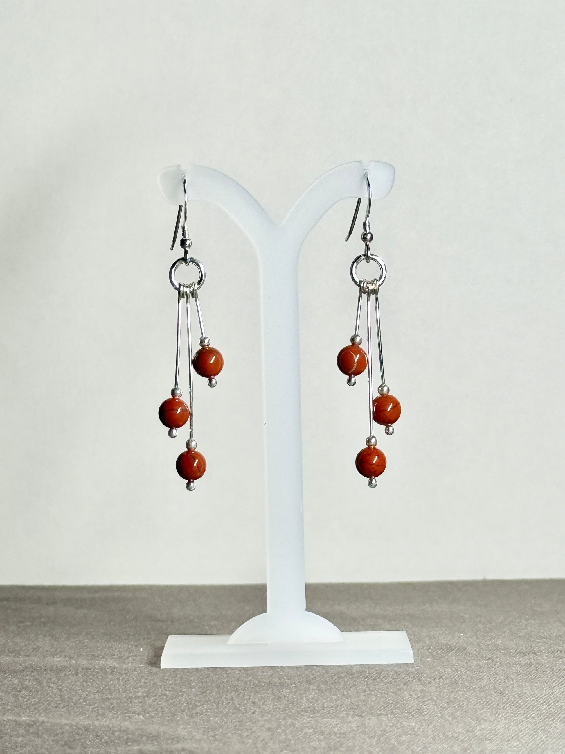 Handcrafted in .925 sterling silver by Paxton Rice. Hanging 60mm long to the lowest bead, this charming accessory is ideal for tastes that prefer a longer dangle without the use of statement jewelry. Each of these 6mm gemstone beads earns its name from the thin, dark veins trickling across the warm, light red background, and they have been individually hand-selected by Mr. Rice for a high-quality match. Each bead rotates freely on its wire, adding movement and depth to this unique pair of earrings.