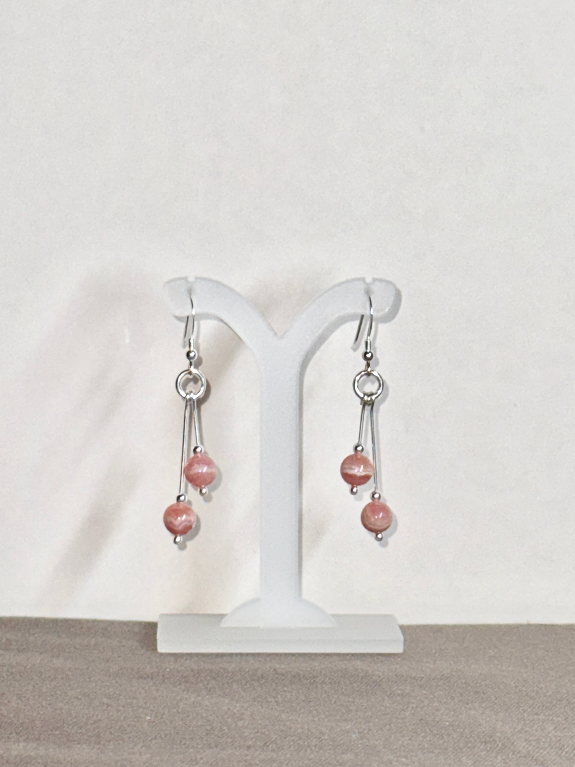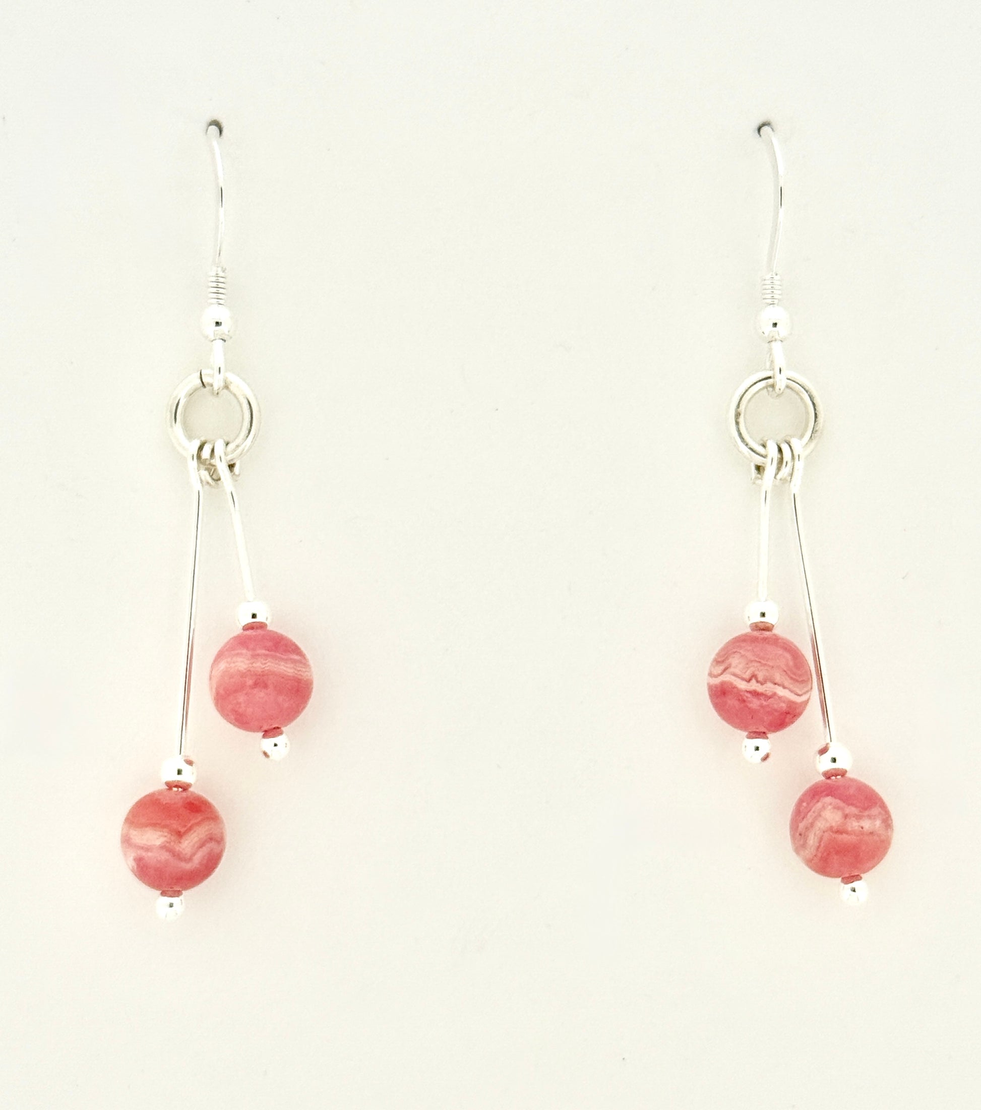 Handcrafted in .925 sterling silver by Paxton Rice. At 50mm long to the lowest bead, this accessory is ideal for tastes that desire a subtle but noticeable dash of color without the length of our tri-dangle style. These 6mm gemstone beads feature a pleasant contrast between their peach-pink background and cream-colored veins playing across the surface, and they have been carefully selected by Mr. Rice for a high-quality match. Each bead rotates independently on its wire, adding movement and depth to this unique pair of earrings.