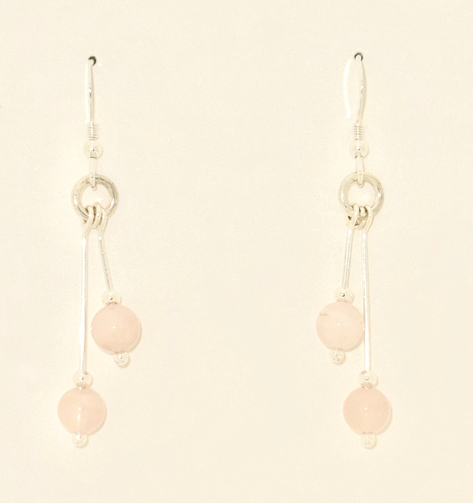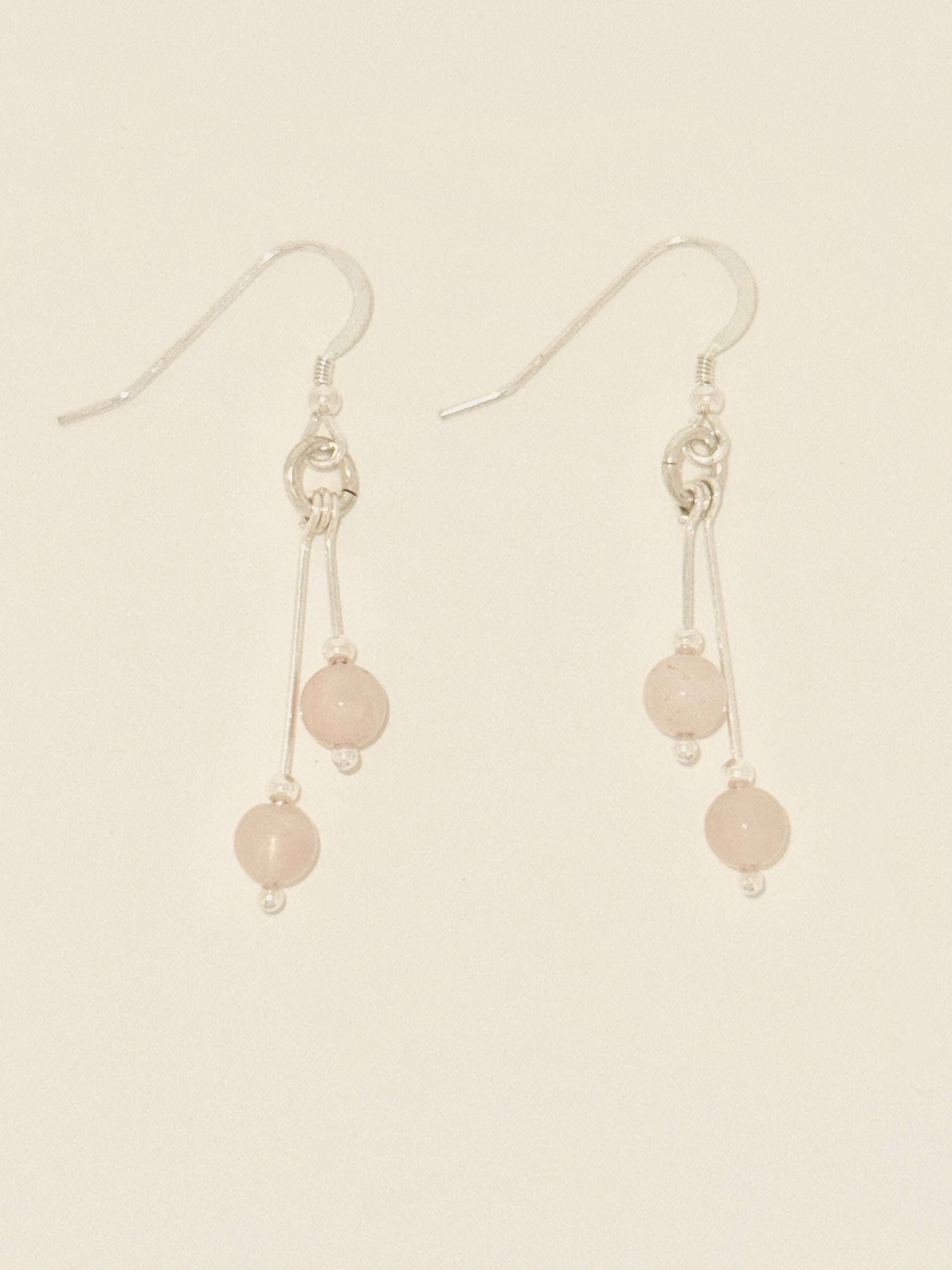 Handcrafted in .925 sterling silver by Paxton Rice. Hanging 50mm long, this lovely accessory is ideal for tastes that desire a subtle but noticeable dash of color without the added length of our tri-dangle style. In the light, these 6mm translucent, pink gemstone beads provide a delightfully soft and gentle complement, and they have been carefully hand-selected by Mr. Rice for a high-quality match. Each bead rotates independently on its wire, adding movement and depth to this unique pair of earrings.