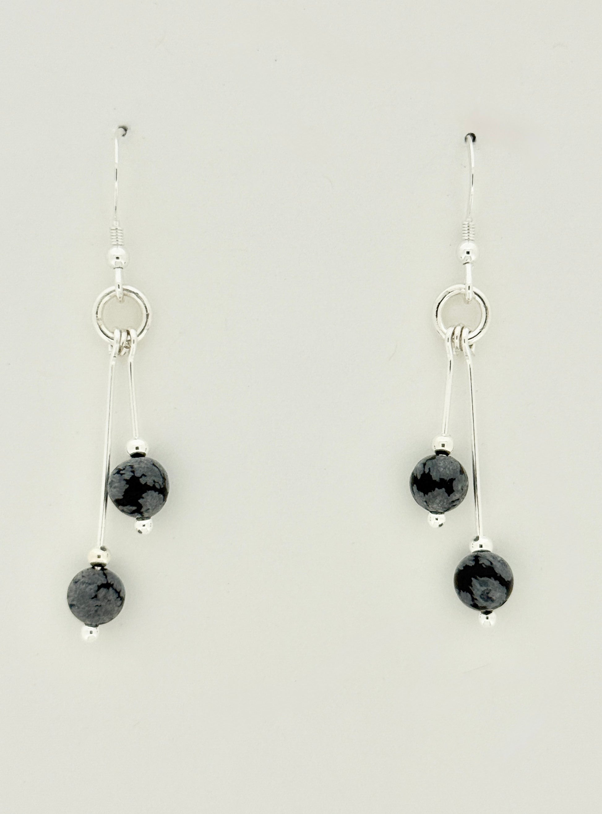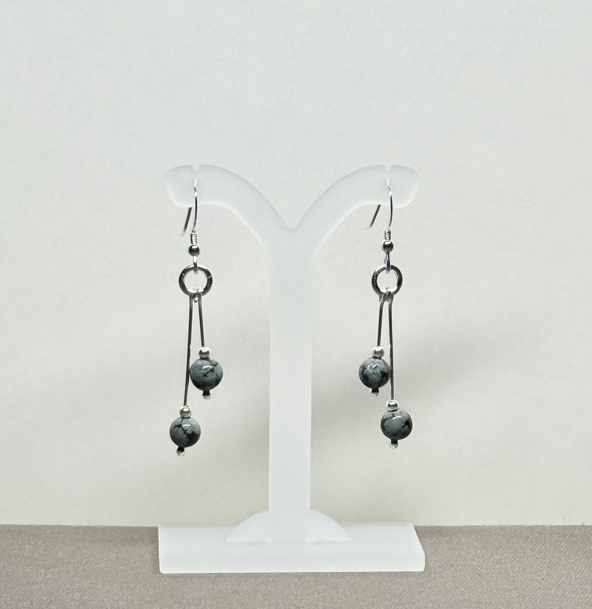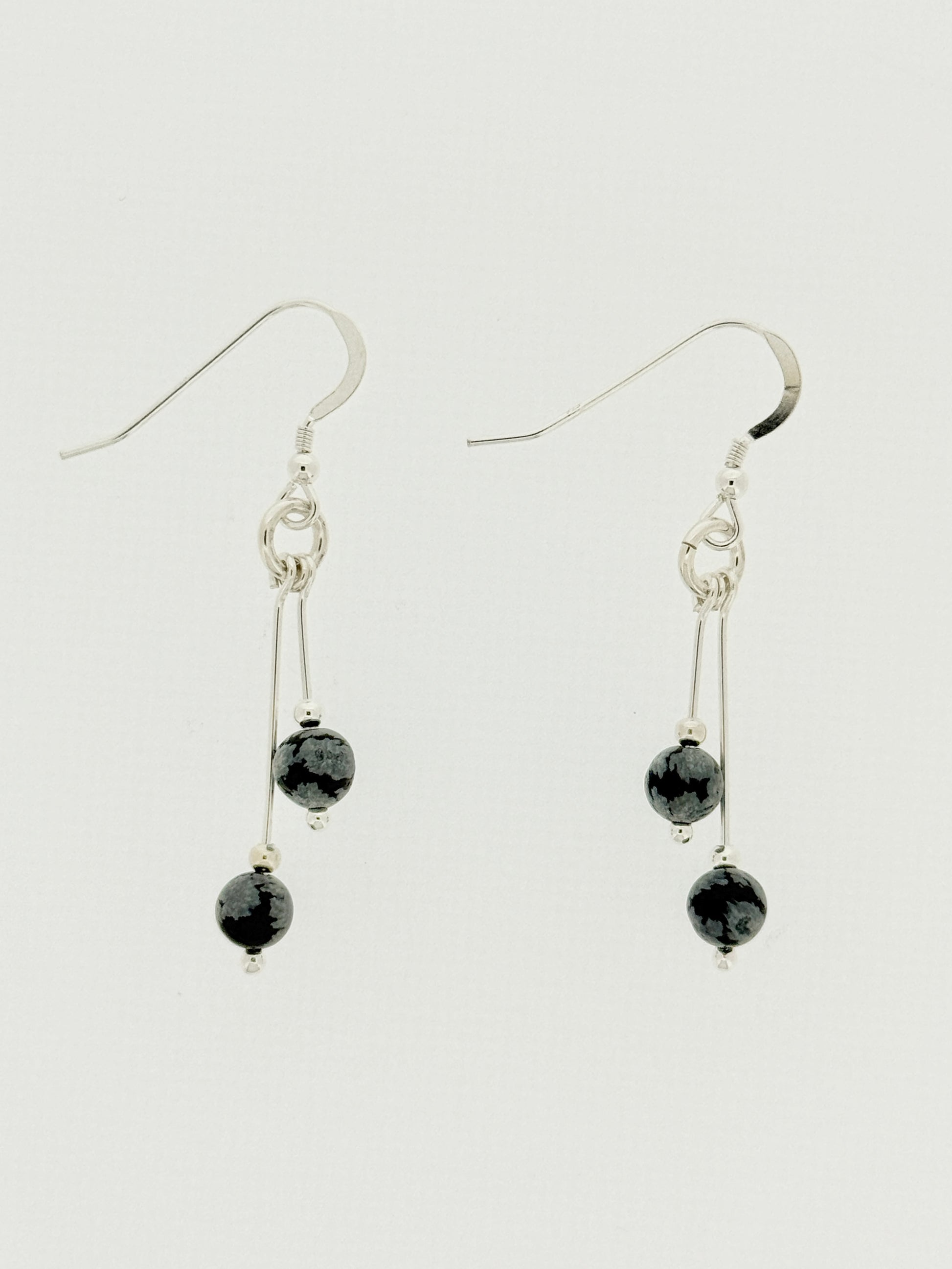 Handcrafted in .925 sterling silver by Paxton Rice. Hanging 50mm long, this lovely accessory is ideal for tastes that desire a subtle but noticeable dash of color without the added length of our tri-dangle style. This stone earns its name from the soft, gray, snowflake-like patterns against its black background, which are excellently showcased in these 6mm beads. These beads have been carefully hand-selected by Mr. Rice for a high-quality match. Each bead rotates independently on its wire, providing additional movement and depth for this unique pair of earrings.