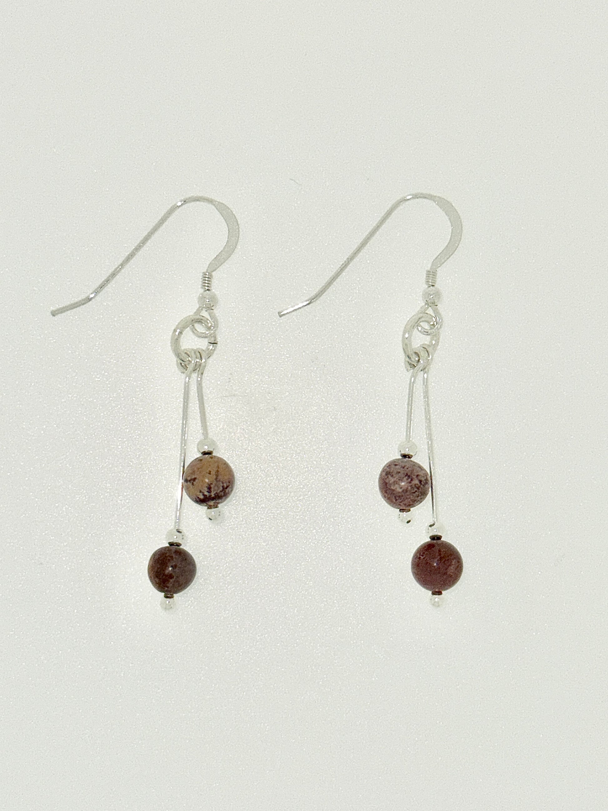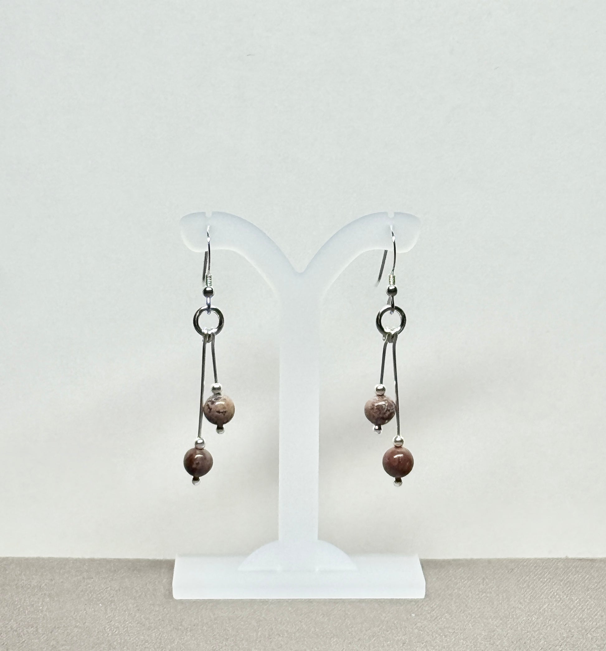 Handcrafted in .925 sterling silver by Paxton Rice. Hanging 50mm long, this lovely accessory is ideal for tastes that desire a subtle but noticeable dash of color without the added length of our tri-dangle style. These 6mm gemstone beads display a pattern of varying shades of cool pinks accented by dark veins and light beige-to-brown patches, and they have been carefully hand-selected by Mr. Rice for a high-quality match. Each bead rotates independently on its wire, providing additional movement and depth for this unique pair of earrings.