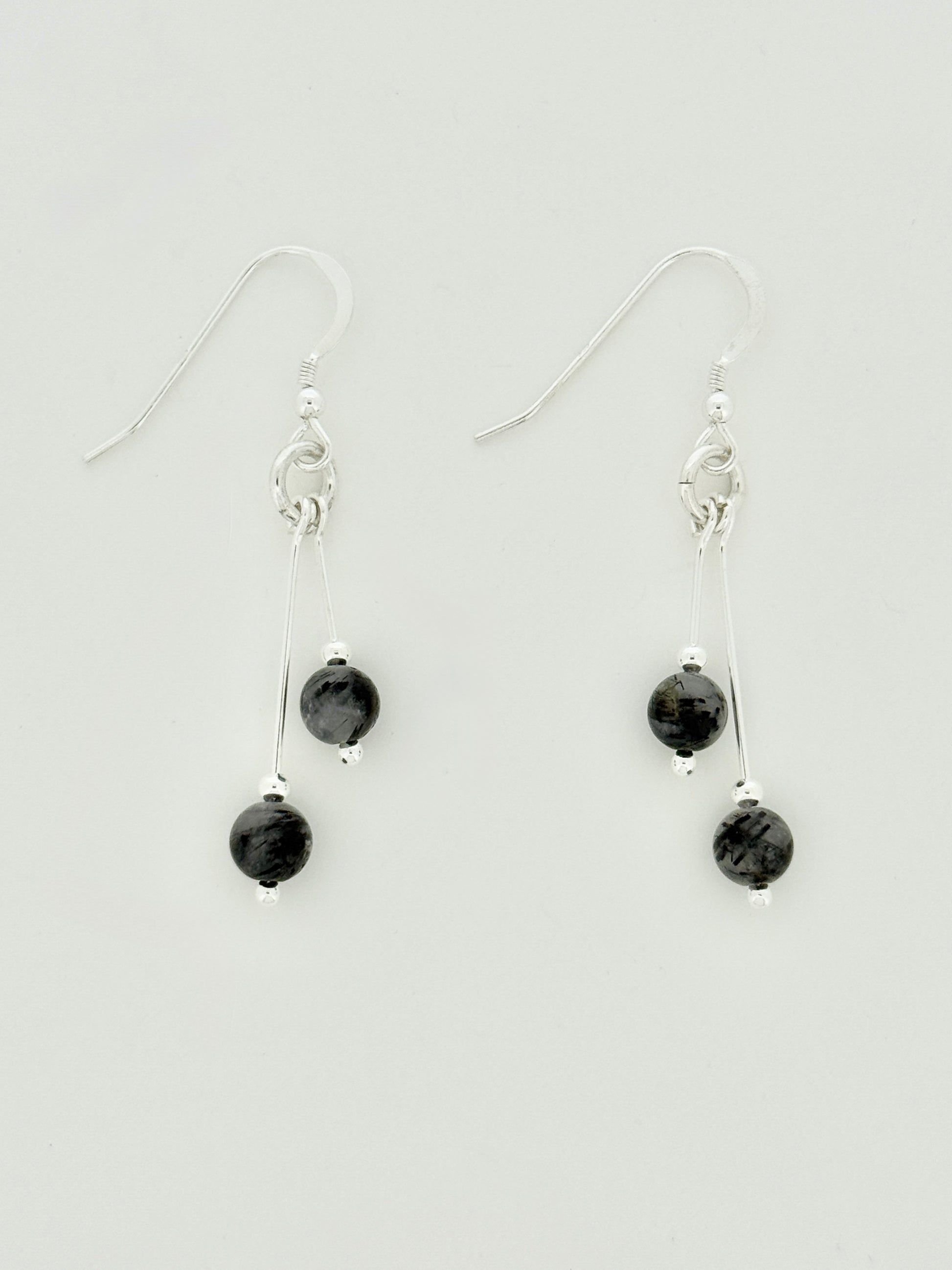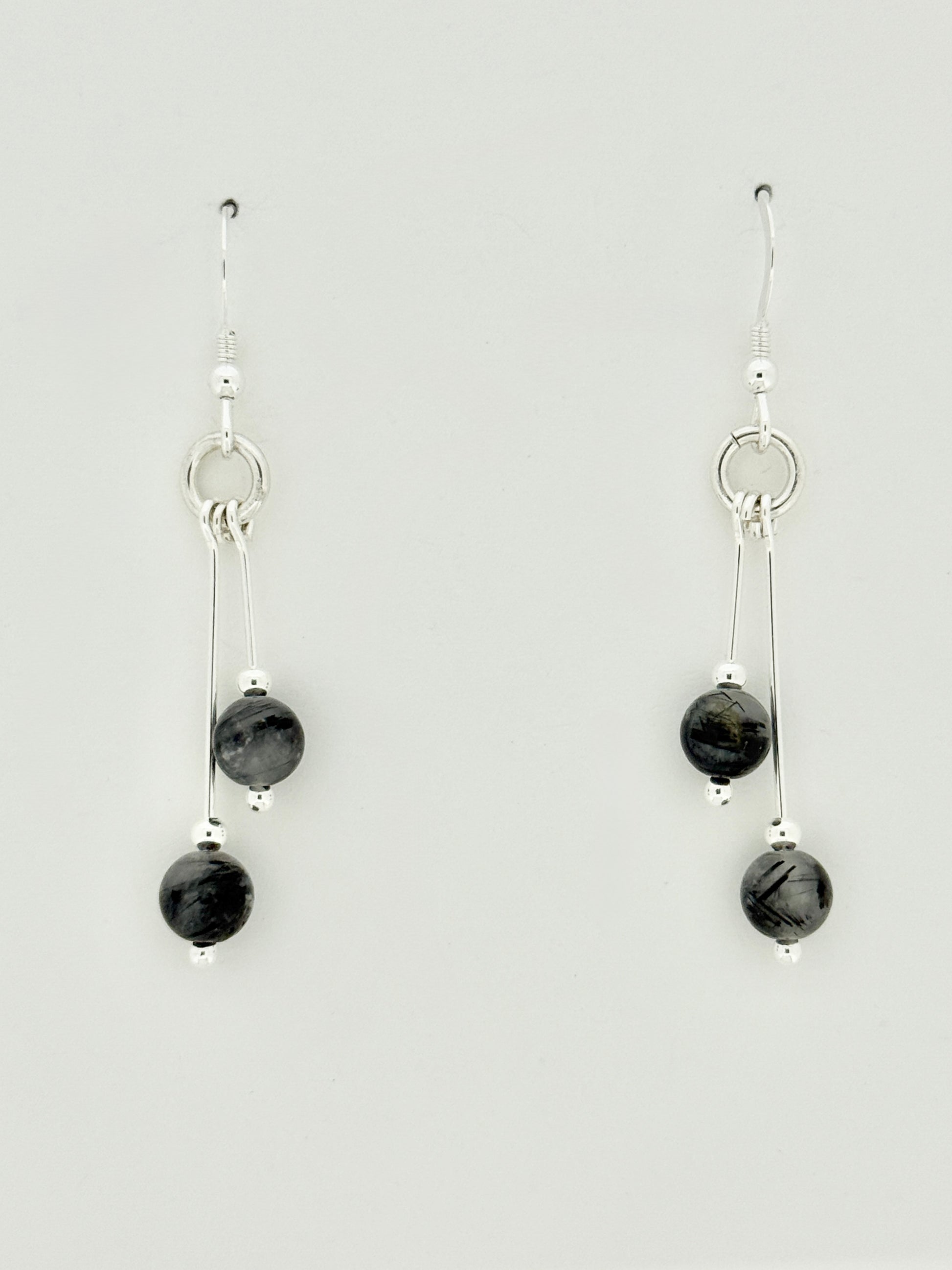 Handcrafted in .925 sterling silver by Paxton Rice. Hanging 50mm long, this lovely accessory is ideal for tastes that desire a subtle but noticeable dash of color without the added length of our tri-dangle style. Each of these 6mm gemstone beads displays a pattern of black tourmaline veins in a semi-translucent, dark-gray quartz matrix, and they have been individually hand-selected by Mr. Rice for a high-quality match. Each bead rotates independently on its wire, providing additional movement and depth for this unique pair of earrings.