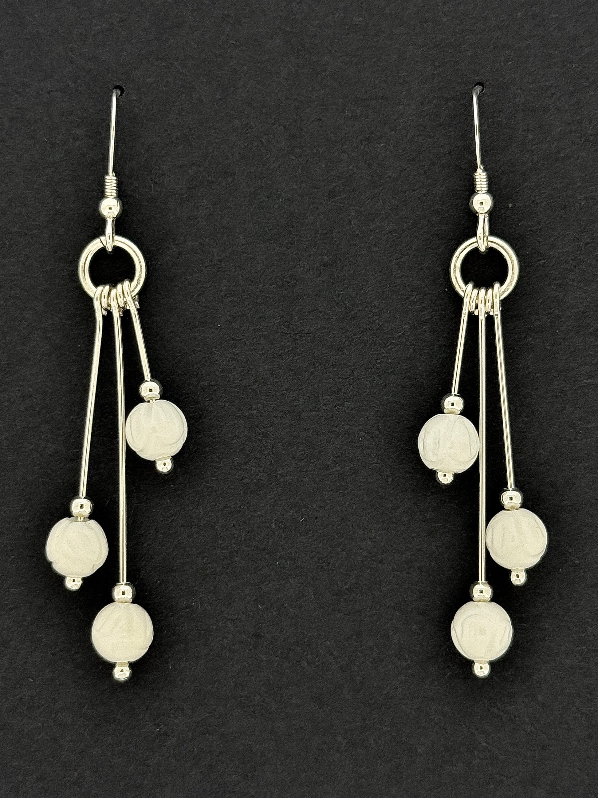 Handcrafted in .925 sterling silver by Paxton Rice. Hanging 60mm long to the lowest bead, this lovely accessory is ideal for tastes that prefer a longer dangle without the use of statement jewelry. Each of these white, 6mm beads has been intricately carved by a skilled artisan, and they have been individually hand-selected by Mr. Rice for a high-quality match. Each bead rotates independently on its wire, adding movement and depth to this unique pair of earrings.